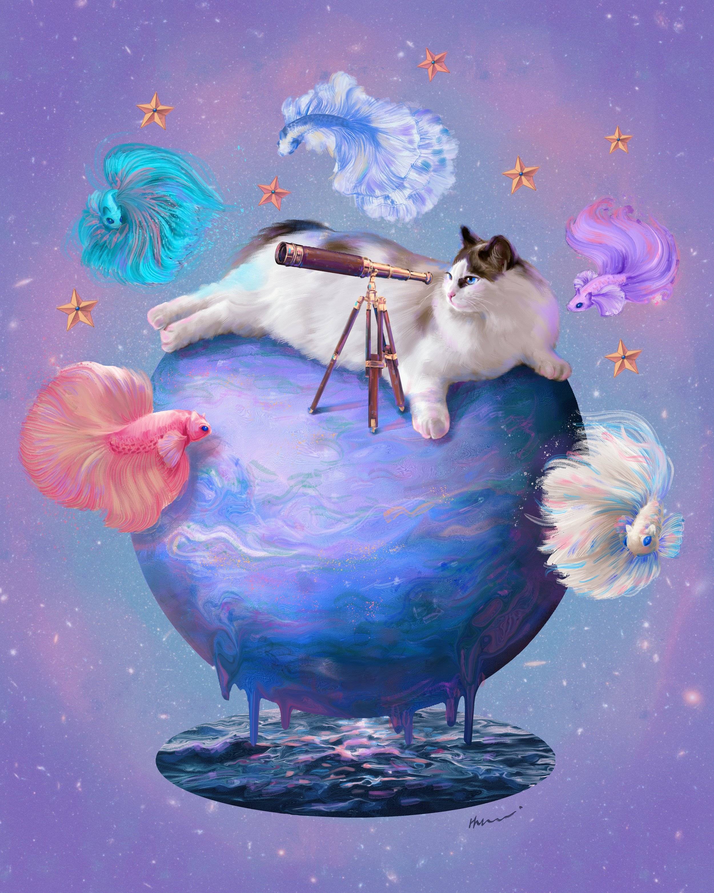 Mond Kim is an illustrator whose work blends cat-themed art with kitschy charm, dreamy tones, and surreal storytelling.